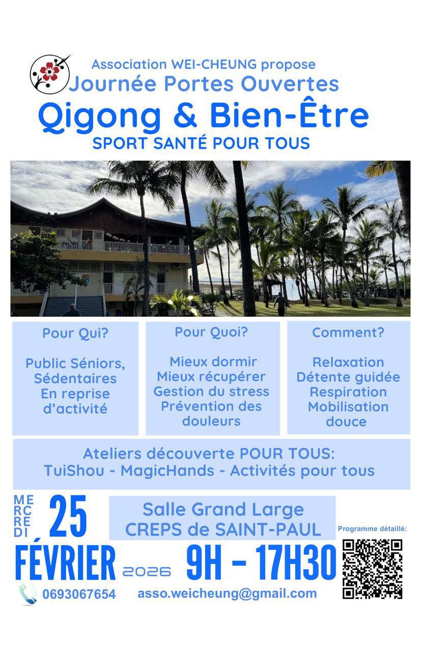 WEI-CHEUNG est une association implantée à La Réunion depuis 25 ans, dédiée à la transmission du Qi-Gong, des disciplines chinoise traditionnelles et d’une pratique corporelle structurée, accessible et progressive. L'association WEI-CHEUNG relie culture, pédagogie, santé, attention et exigence technique, afin d’offrir au public un cadre sérieux pour découvrir, approfondir et intégrer ces disciplines dans la durée.